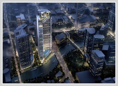 One River Point by Rafael Viñoly gives Miami’s downtown renaissance its defining architectural statement. Two slender 60-story towers rise above a floating podium from which a serene waterfall cascades 85 feet to a shimmering pool below appearing to flow into the Miami River. From its vantage point within the lush parkland setting, the elevated podium affords broad vistas across the river, the city and to the bay beyond.
